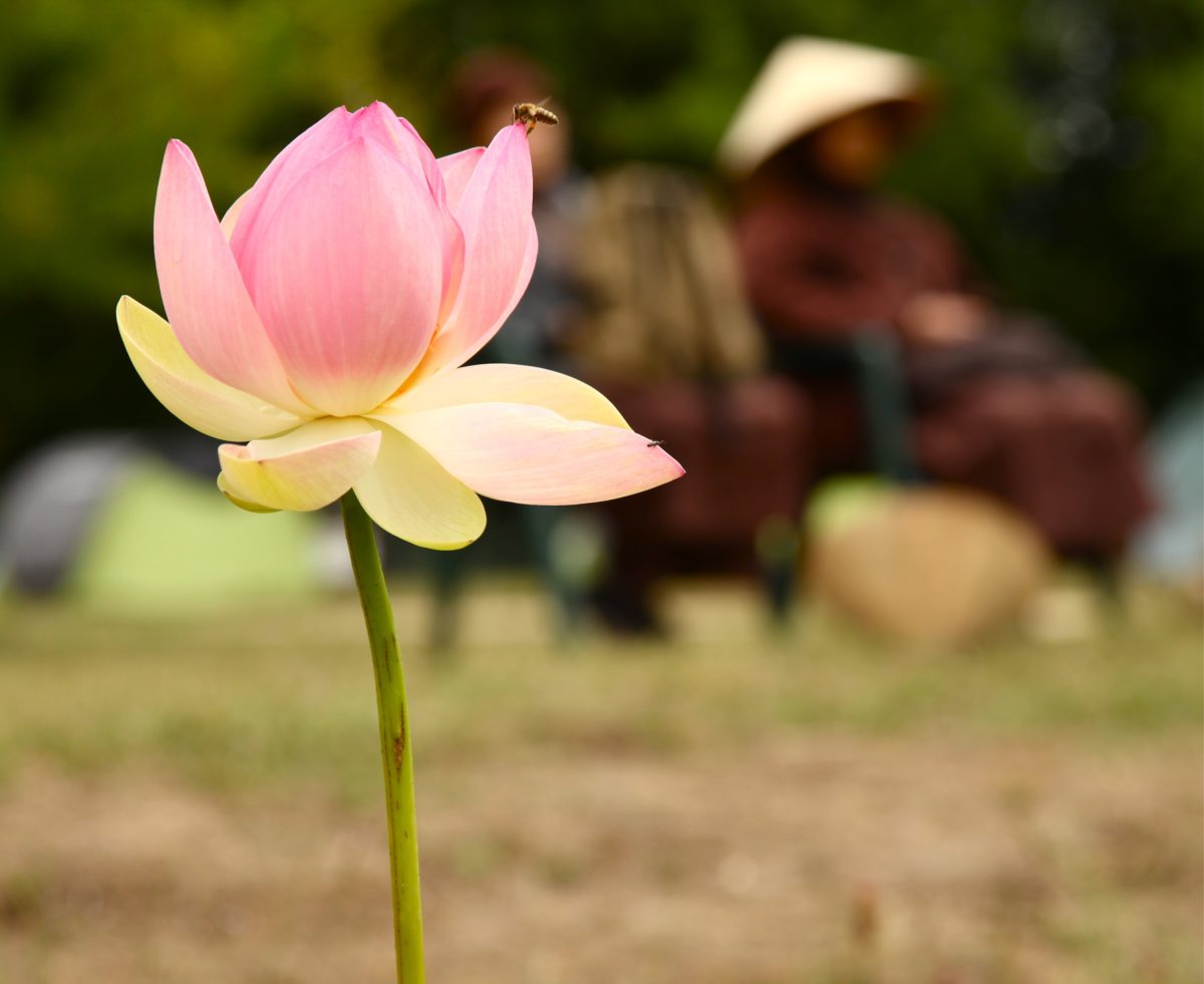 I knew that someone else would soon receive my irritation and tiredness through further unmindful speech on my part. I had to come to a stop and take care of the irritation and tiredness that was the root of my unmindful speech. I took off my apron and did slow walking meditation to the lotus pond, attaching my concentration and awareness to each in-breath and each out-breath. The slow walk from the kitchen to the lotus pond took about thirty minutes. Once there, I sat on a bench, became still and very present, and had a quiet talk with myself. During this conversation in my mind, I asked a question: Why am I here in Lower Hamlet?