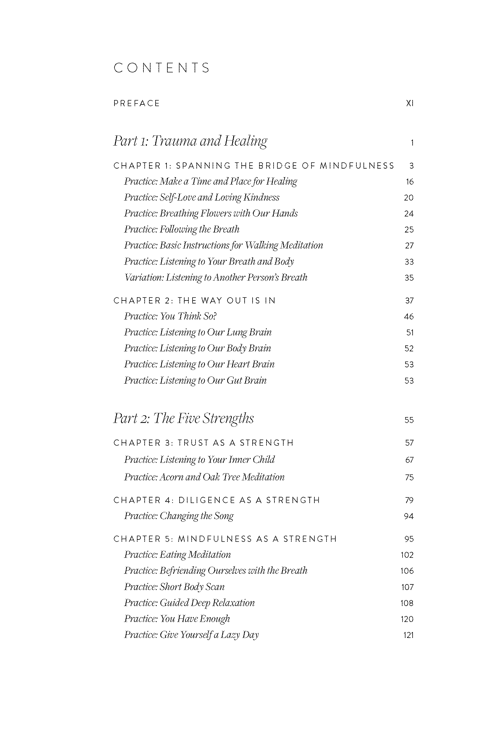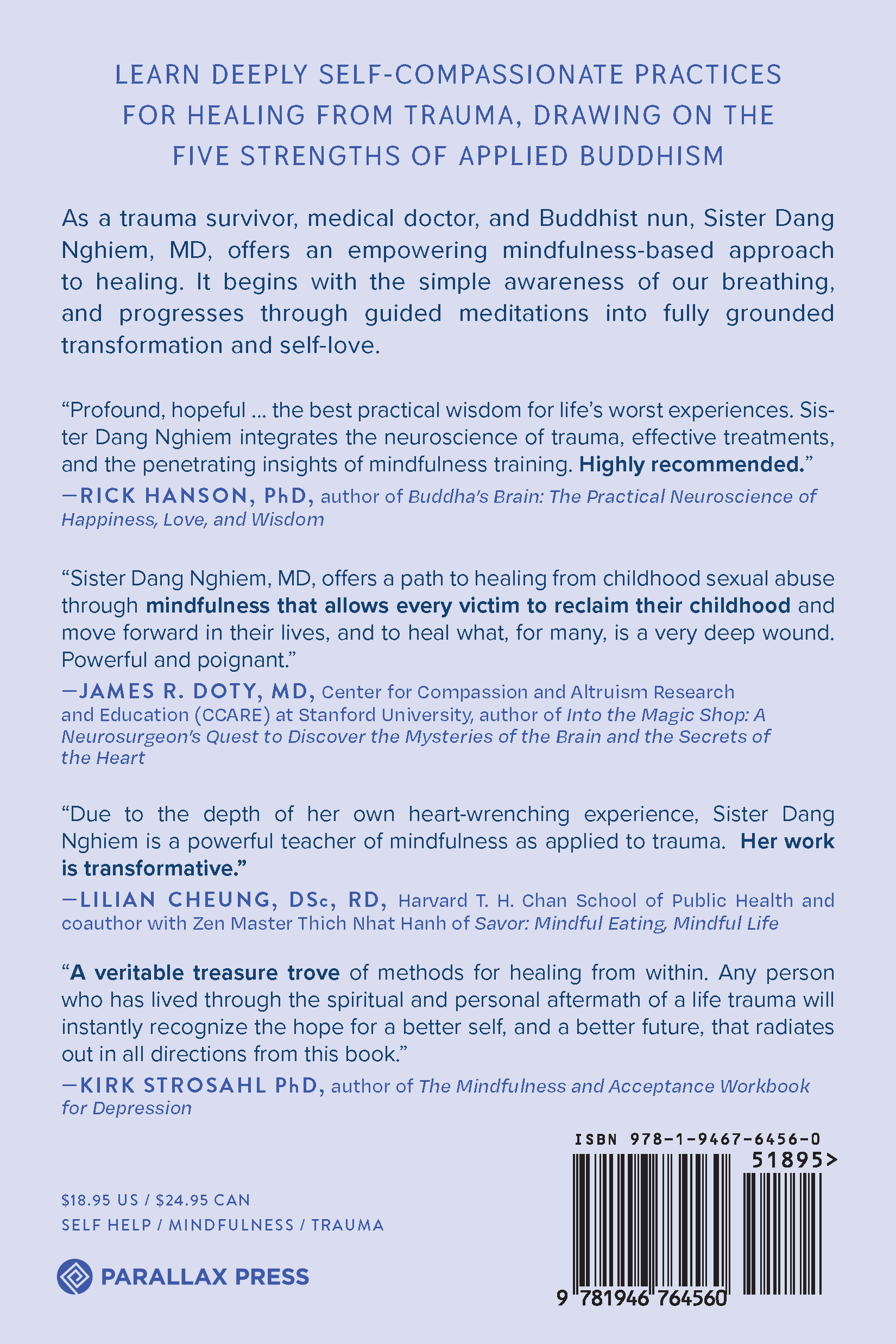 Offering insights from Buddhist psychology and simple somatic practices for tapping into our Five Strengths–our inner faculties of self-trust, diligence, mindfulness, concentration, and insight–Sister Dang Nghiem’s approach to trauma is radically accessible; it begins with awareness of our breathing. With each chapter containing a progression of guided reflections an exercises, this book can be read as an adjunct to therapy and a helpful guide for moving through trauma in the body. With the practice of mindfulness, we can access our strength as survivors and our joy in being alive.
