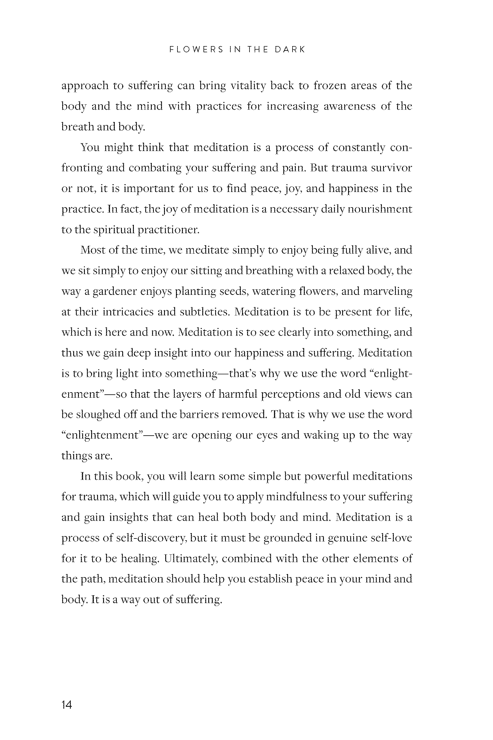 Mindfulness teacher Sister Dang Nghiem, MD, is an inspiration for anyone who has ever suffered from abuse, life-changing loss, severe illness, or the aftermath of war. In Flowers in the Dark, she brings together her lived experience as a survivor, certified MD, and ordained Buddhist teacher to offer a body-based, practical approach to healing from life’s most difficult and painful experiences.
