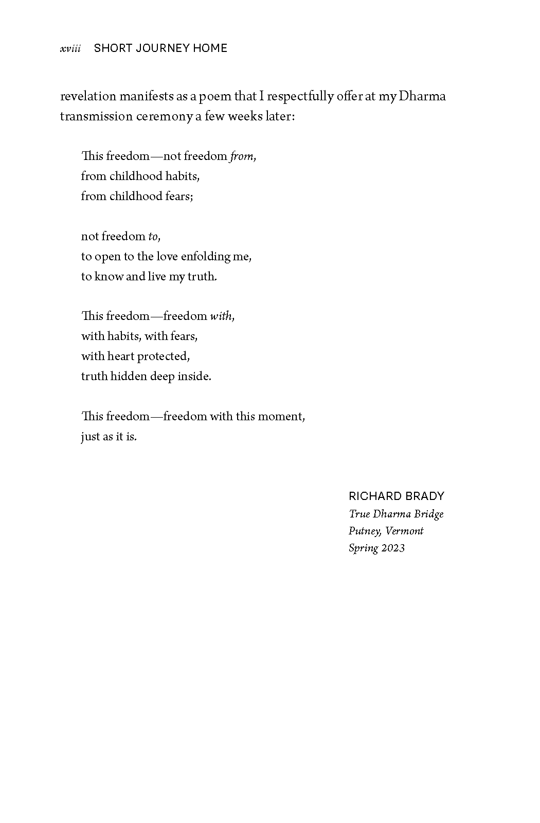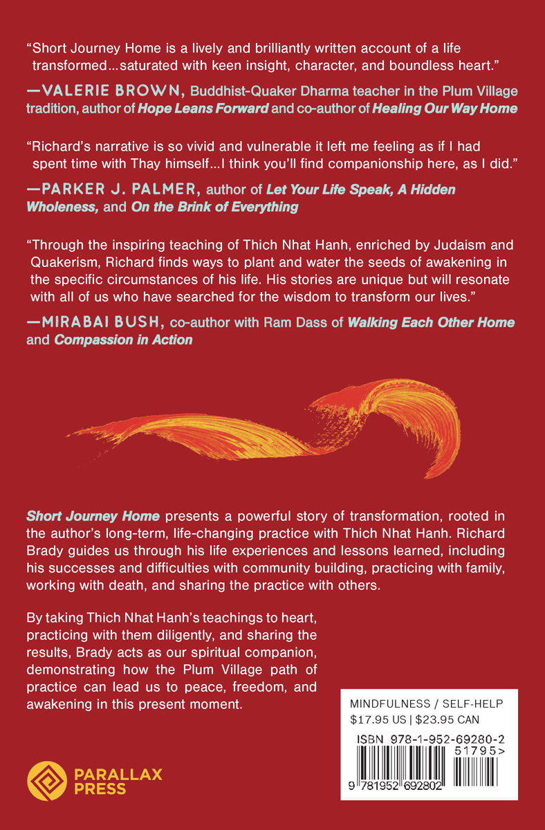 "From math teacher to Buddhist Dharma teacher, fellow Quaker, Richard Brady’s latest book, Short Journey Home is a lively and brilliantly written account of a life transformed. A work of imagination, generosity, and penetrating wisdom, guided over decades as a student of Zen Master Thich Nhat Hanh and the Plum Village community, Brady’s is a life well lived, saturated with keen insight, character, and boundless heart."